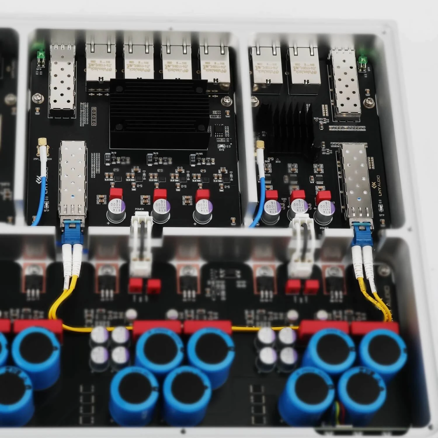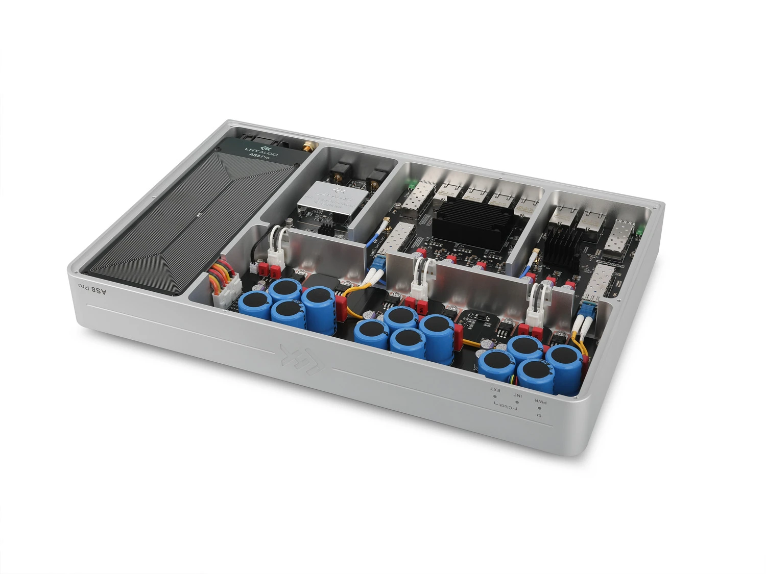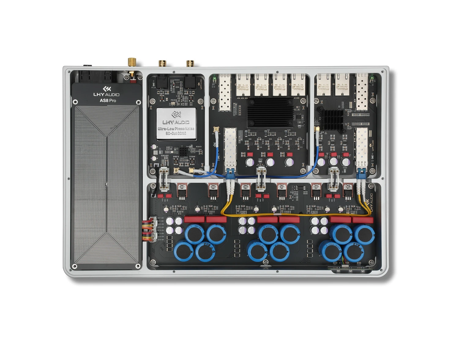 Sieťový šum do audio systému nepatrí – a AS8 Pro+ zabezpečí, aby sa tam nikdy nedostal. Prístroj využíva unikátnu architektúru vnútornej optickej izolácie, ktorá rozdeľuje switch na dve nezávislé domény: hlavnú 2.5G dátovú zónu a izolovanú 1G audio zónu.