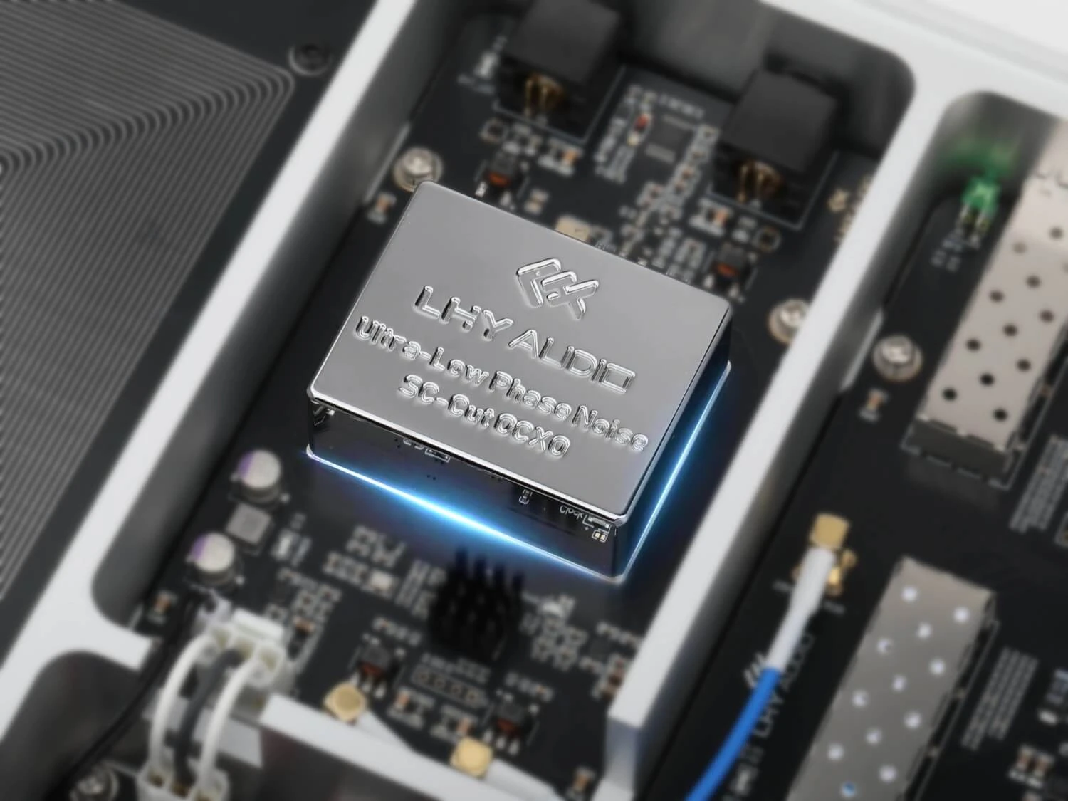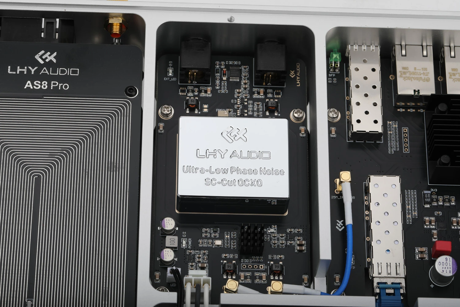 V jadre modelu AS8 Pro+ bije ultra-presný oscilátor typu SC-Cut OCXO (Oven Controlled Crystal Oscillator). Na rozdiel od bežných priemyselných hodín v štandardných sieťových zariadeniach, tieto referenčné hodiny dosahujú fázový šum nižší ako -112 dBc @1Hz offset.