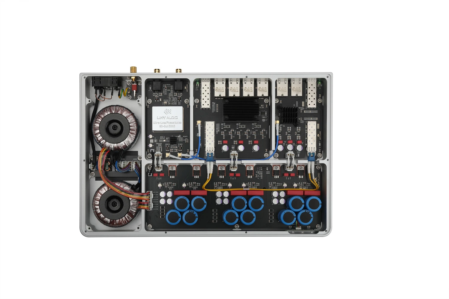 - Zdvojená filtračná kapacita 56400µF (kondenzátory Vishay) - veľký energetický rezervoár vyhladzuje výkyvy zo siete a drží napájanie stabilné aj pri náhlych nárokoch digitálnych obvodov.