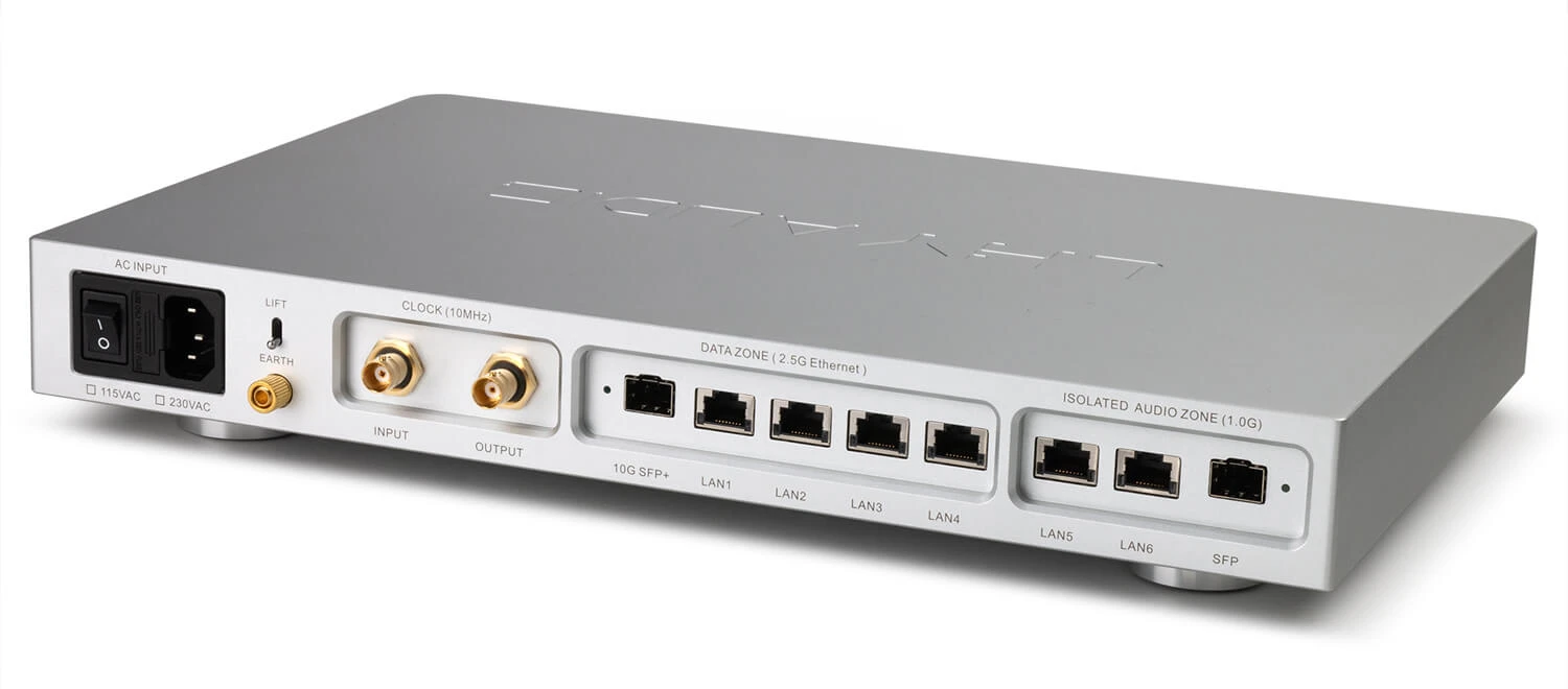 Vlajkový audiofilský sieťový switch s vstavaným SC-Cut OCXO oscilátorom, optickou izoláciou medzi 2,5G a 1G zónou, duálnymi toroidnými transformátormi a CNC-frézovaným celoalumíniovým šasi. Navrhnutý od základov pre najčistejší možný prenos dát v high-end audio systémoch.