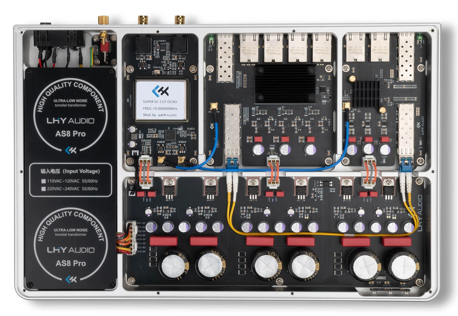 Na rozdiel od väčšiny konkurenčných hifi switchov, ktoré používajú lineárny zdroj len pre prvý stupeň a potom pokračujú DC-DC meničmi, AS8 Pro má skutočne plne lineárne napájanie bez jediného DC-DC prevodníka na celej doske.