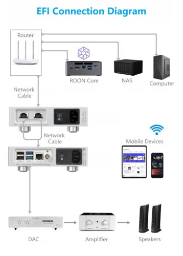 Ak už používate alebo zvažujete LHY Audio AS8 Pro alebo AS8 Pro+, EFI je výborným doplnkom. Môžete ho zaradiť pred switch, aby ste odfiltrovali šum ešte skôr, ako sa dostane do hlavného prepínacieho uzla, alebo za switch priamo pred streamer pre maximálnu izoláciu. Každá ďalšia vrstva filtrácie v sieťovom reťazci znižuje šumové pozadie a prináša počuteľné zlepšenie v detailnosti, priestorovosti a celkovej čistote zvuku.