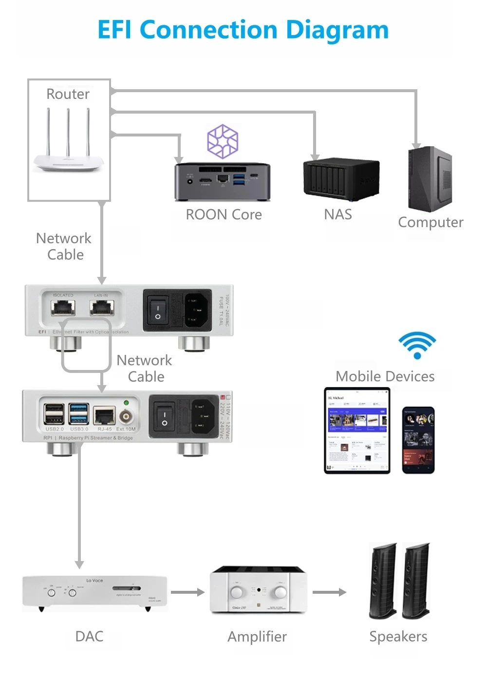 Zapojenie je jednoduché. Ethernetový kábel z vášho routera alebo switcha zapojíte do jedného portu na EFI a z druhého portu vedieme kábel priamo do streameru. EFI sa zapojí do elektrickej siete priloženým IEC káblom a je to. Žiadna konfigurácia, žiadne nastavovanie - plug & play.