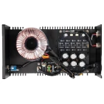 - Filtrácia - hlavný filtračný kondenzátor s kapacitou 10 000μF (low-ESR, audio-grade elektrolytický) vyhladzuje usmernený jednosmerný prúd. Veľká kapacita zabezpečuje dostatočnú energetickú rezervu pre náhle prúdové špičky, čo je kľúčové pri dynamicky náročných hudobných pasážach.