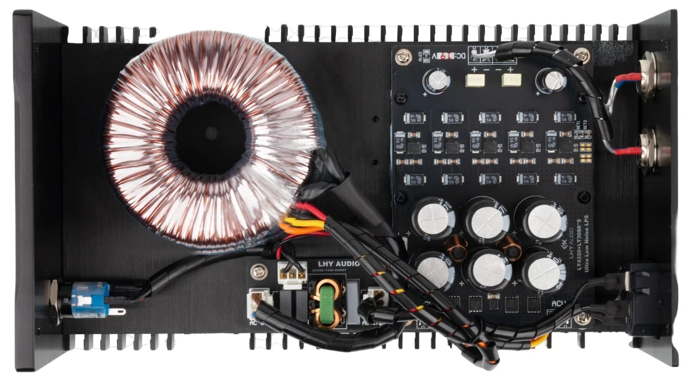 LPS-120 je výkonný lineárny napájací zdroj od LHY Audio s výkonom 120W, určený pre zariadenia s vyšším prúdovým odberom - NAS servery, aktívne reproduktory, výkonné streamery, mini-PC alebo profesionálne audio rozhrania. Ručne spájkovaná konštrukcia s toroidným transformátorom Talema/Noratel (120VA), diskrétnou OP-AMP + MOSFET reguláciou a hlavným filtračným kondenzátorom 10 000μF zabezpečuje zvlnenie pod 29μV RMS. Dva simultánne výstupy cez letecké konektory GX16. Hliníkové šasi s extrudovaným chladičom (800cm² chladiaca plocha) pracuje úplne pasívne - bez ventilátora.