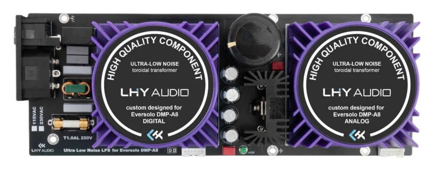 LHY Audio LPS-A8 je interný lineárny napájací modul pre EverSolo DMP-A8. Dva nezávislé 35VA toroidné transformátory s trojitým tienením a duálne LT3042 regulátory znižujú šum napájania pod 10μV – približne 100× menej ako originálny spínaný zdroj. Prémiové filtračné kondenzátory Mundorf a Rubycon, postiebrená interná kabeláž, keramická poistka. Plug and play inštalácia bez spájkovania, kompletné náradie v balení.