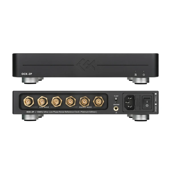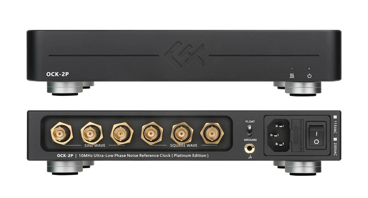 Referenčné externé systémové hodiny Nástupca obľúbeného modelu OCK-2S prichádza s vylepšeným OCXO oscilátorom (-115 dBc @1 Hz), dvojstupňovou reguláciou napájania, 30 VA transformátorom Noratel a päťkomorovým CNC šasi s termoizolovanou komorou pre OCXO. Zariadenie disponuje 6 nezávislými výstupmi (3× obdĺžnikový signál – square wave, 3× sínusový signál – sine wave) s distribúciou hodinového signálu s ultra nízkym prídavným fázovým šumom. Prepínateľné uzemnenie zabezpečuje optimálne začlenenie do zostavy. Výsledkom je počuteľne stabilnejšia zvuková scéna, presnejšie priestorové zobrazenie, lepšie rozlíšenie mikrodetailov a „tmavšie“ pozadie medzi tónmi.