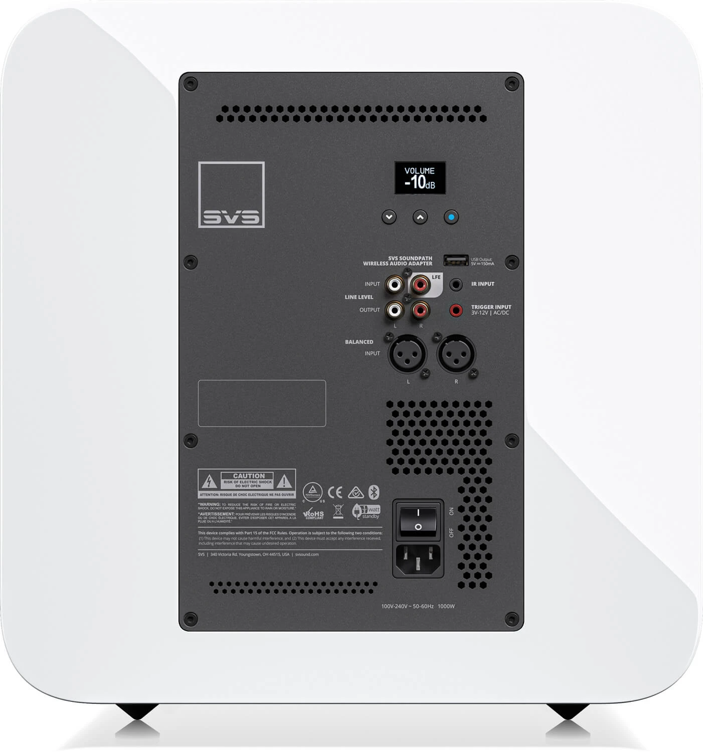 - Trigger vstup (3,5 mm, 3 - 12 V AC/DC) - a USB port pre voliteľný bezdrôtový adaptér SVS SoundPath Wireless Audio Adapter.