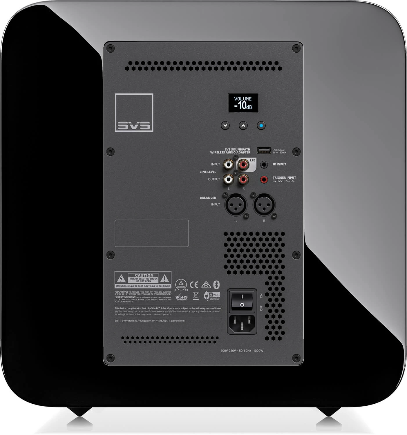 - Trigger vstup (3,5 mm, 3 - 12 V AC/DC) - a USB port pre voliteľný bezdrôtový adaptér SVS SoundPath Wireless Audio Adapter.